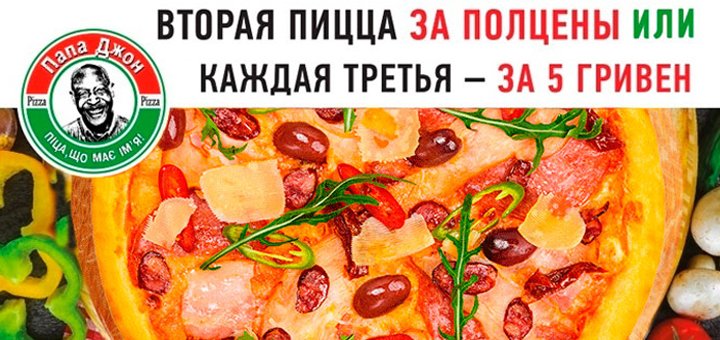 Ordering two or three medium pizzas? Then you are entitled to a present from Papa John! For everyone who orders pizza for themselves and their friends, a special offer is offered: every second average pizza -50% or every third - for only 5 hryvnia. Offer is valid for all medium sized pizzas when ordered for delivery Monday through Thursday.